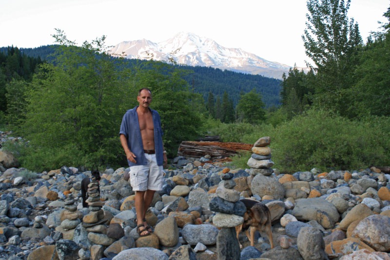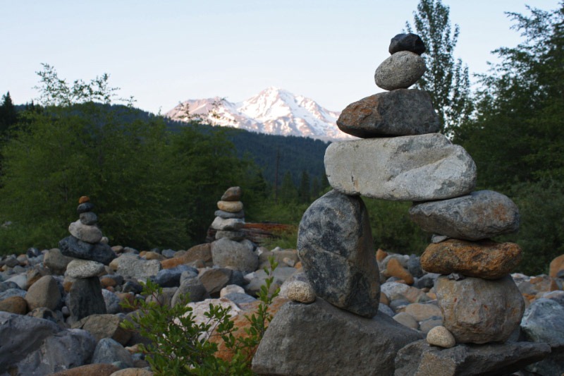 The Sacramento River flows out of the lake, and we stopped by the edge of the river on a whim. We found that on the rocky shores of the river people had arranged the stones into the most astonishing rock piles. Who knows? Maybe it was the Lemurians who did it.