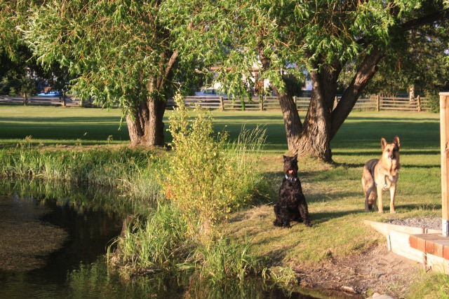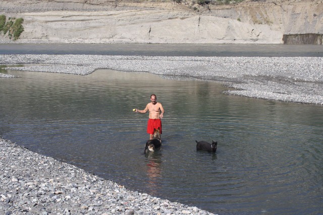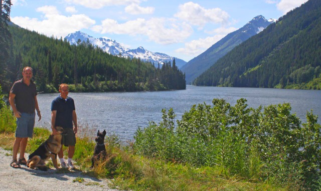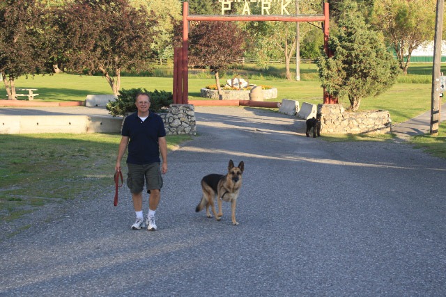 Lillooet is generally the hottest spot in British Columbia on any summer day with temperatures typically around 100 or more. It was only about 80 today, but that was plenty hot enough for the dogs. The young women at the information center had suggested to us that we could bring our dogs down to the bank of the Fraser River to get wet. They said that there were little pools on the edge of the river where we wouldn’t have to worry about the current. After taking a couple wrong turns, we finally found the spot and the dogs had a great time.