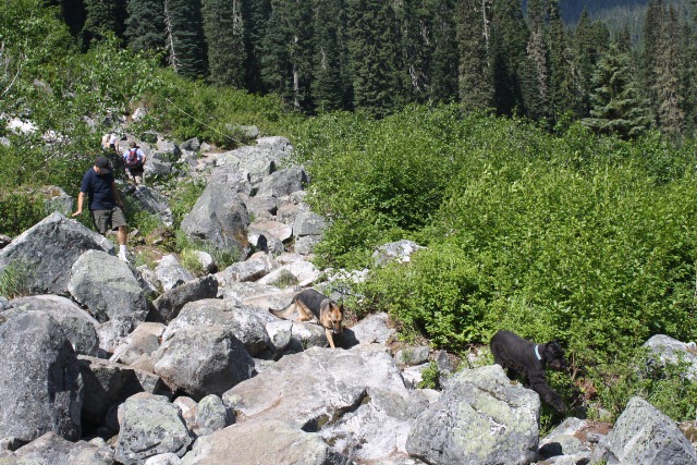 The path changed fairly quickly from dirt and tree roots to rocks. The rocks grew bigger and bigger the farther we walked. After a while, we were clambering over boulders. We let the dogs off leash here, and they did reasonably well for a while. But finally the rocks were just too big for Eli. His back legs are not that strong and there was only so much he could do with just his forelegs. We decided to turn back.