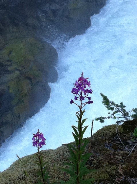 We left Whistler relatively early. Our first stop, only about 20 minutes away, was Nairn Falls Provincial Park. The falls are located about a half mile from the entrance to the park. The trail is not hard to walk, but it is right on the edge of a steep hillside. The snowfall was heavy this winter, and so the runoff with the summer melting is also quite intense. We kept the dogs on leash here, not just because it is the official park policy but because one slip into that river would have been the last time we ever saw them. The falls themselves are not that steep. They are the remains of an eroded volcano, and the river has to flow through a couple narrow channels as it falls.