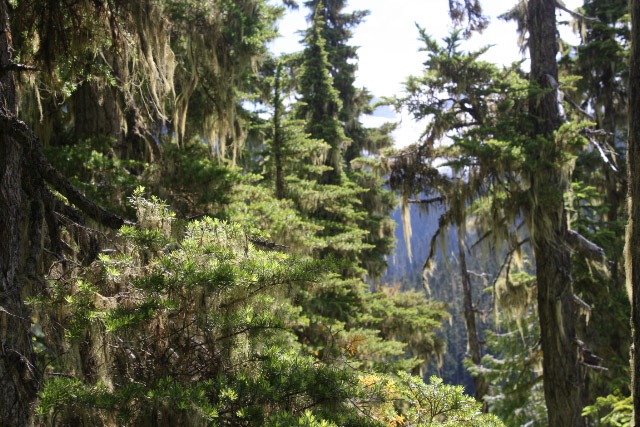 There’s a five kilometer trail which leads from the lower lake to the glacier. John surprised me by suggesting that we hike it or at least part of it. We did not have to get far away from the lake for the mosquitoes to dissipate. We were surprised as we walked down the trail to find Spanish Moss covering the branches of pine trees. I would have thought that it was too cold up here for this to flourish. I guess it is hardier than I supposed.