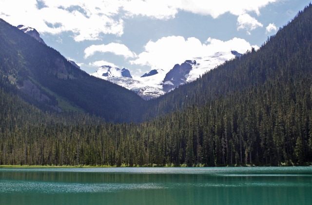 Leaving Nairn Falls, the road seems to gain elevation quickly. I watched a couple of cyclists carrying camping gear working arduously to gain only a few yards. The scenery was spectacular with rocky cliff sides, thick pine forests, and glacier-laden peaks above the tree line. After about a half hour, we arrived at Joffre Lakes Provincial Park. This park consists of three lakes, all fed by the summer melt from the glaciers above. The first of the three lakes is only a short walk from the park entrance.