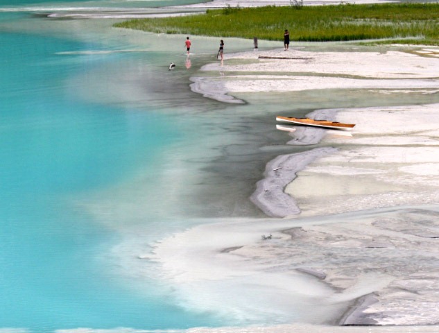 As usual, the trail back was a bit easier. We were tempted to let Edie off-leash to make it easier to walk, but when we saw some horses on the trail we thought better of it. Towards the end of the trail, we reached the point where the stream from the melting glacier enters the lake. Glacial silt, the fine sand formed from the crushed rock beneath the glacier, not only give the lake its famous turquoise color but also creates a beach of sorts at the delta.