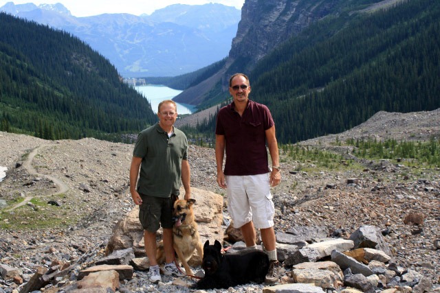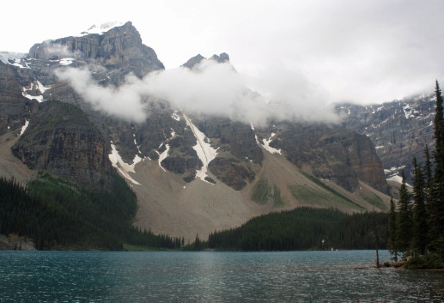 The rain began to diminish, so we went back to the hotel and picked up the dogs. We drove this time to Moraine Lake. This is smaller than Lake Louise, but in some ways it is more dramatic. The lake is named after a pile of rock slag left at one end by a retreating glacier. Around the lake, ten different mountain peaks are visible. Some of these were covered in clouds which came and went as we did our lakefront walk. There were relatively few tourists here, so the dogs could really frolic.