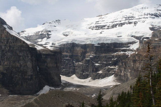 The area is dominated by the Victoria glacier. The lake is named after one of Queen Victoria’s daughters. I guess the nineteenth century Englishmen who gave names to all these places thought of the glacier as the mother of the lake. Although still a very impressive ice field, the Victoria glacier has diminished considerably in the last 50 years as a result of climate change.