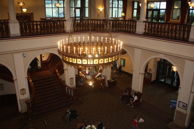 While the exterior of the hotel shows extensive renovations, some parts of the interior are still old and somewhat charming. In the picture below, you can see the lobby from the mezzanine. The Canadian Pacific chose to market the Lake Louise area as the North American Alps, so there is a vague Swiss theme throughout. You can see a bit of that in the chandelier.
