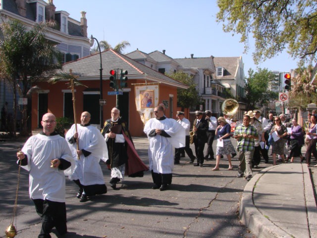 I awoke to discover that we were famous. Well, not really, but there on the front page of the Times-Picayune was a picture of the parishioners of Saint Anna’s marching down Esplanade, and there on the left side of the picture was John. I pointed it out to Leigh, one of our hosts, and she seemed equally excited. She laughed, “You’ve only been here one day and you’ve already made the front page of the paper!” John was even happier – well, he was after he had had his first cup of coffee.