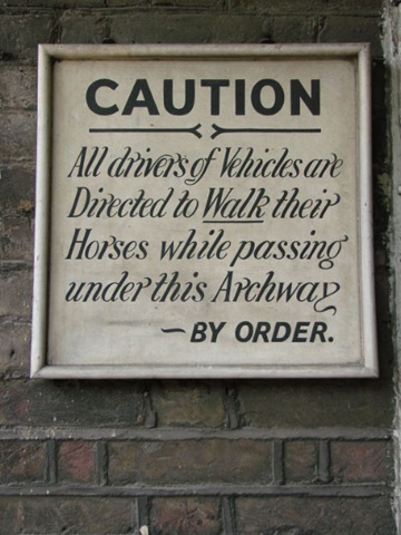 I found this sign in an archway on Cheney Mews. I did learn what a “mews” is. These little alleys were not always the most fashionable addresses in London. “Mew” comes from the Old French word for molting, and they were originally barns where hunting falcons were kept when they were molting and therefore useless for sport. As keeping birds of prey lost favor, these barns were turned into stables, and the upper floors became servants quarters. With the advent of the automobile, the ground floor stables became garages. The mews are the most fashionable places to live in London because they resemble suburban tract houses with an entire ground floor devoted to storing the automobile.