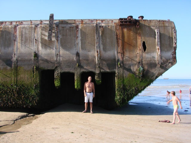 From there we continued on to Arromanches. Here you can still see the remnants of the artificial harbor created by the allies to bring war supplies from England to Normandy. The allied war commanders understood that a reliable supply chain was essential. So, once the coast had been secured, massive concrete breakwaters were hauled across the channel to protect from the bad weather. They then installed huge steel piers. These went out quite a distance as the Channel shore is quite shallow and has big tides.