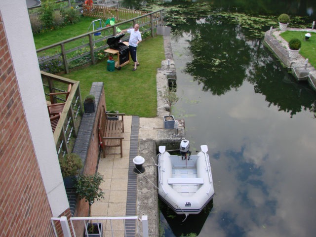 After three plays in one day and a late night, we were lethargic tourists on Sunday. We didn’t get up until late. Jerry and Vicki had celebrated their anniversary on Saturday, and unfortunately the seafood Jerry ate did not agree with him. So nobody felt like having big adventures. But little ones were possible. Jerry pulled the boat our fro m its storage place and suggested that John and I have a turn around the canal. Here’s a picture taken later in the afternoon when Jerry was cooking dinner of the boat and the dock.