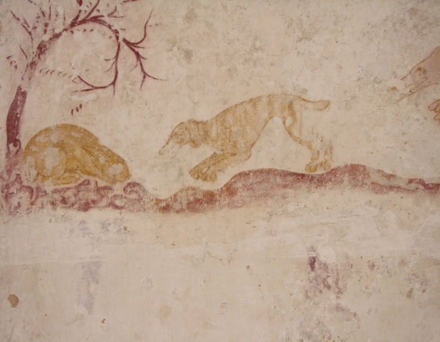 This little church was never restored and the walls show the remains of the frescoes which once covered the interior of the church. There was an image of Saint Christopher, one of Saint Michael weighing the souls of the righteous, and this one, my favorite, of a hunting scene. The little pamphlet suggested that this may have served as a warning against Sabbath violations.