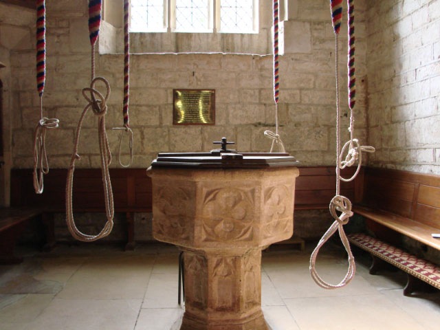 We continued on the road until we came to the village of Guiting Power. It is a bit larger than some of the other villages. It even has a post office and a dog park! But the two pubs in town were completely deserted in the late afternoon, so John and I bought some soggy pastries from a grocery and a couple of pints of milk and had a late lunch in the village green, right next to the inevitable World War I memorial. We had decided to skip the church, but on a whim went in anyhow. It proved interesting. Parts of the building still preserve some of the original Norman decoration. They had on display a sarcophagus for a child which dated from the Saxon period. This had apparently been discovered when doing some routing work on the floor of the church. And we loved the placement of the font at the base of te tower below the bell ropes. It looks like the ancient custom of change ringing has not been forgotten in Guiting Power.