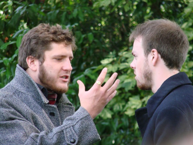 Leaving the church, we stumbled upon a free production of Hamlet done by the Gloucestershire Youth Players. We were prepared to think, “Oh, how sweet! They’re trying their best.” But it turned out that some of the actors were very talented indeed and brought a lot of energy to their roles. Even I was impressed. Here is Hamlet, on the right, confronted by the ghost of his father.